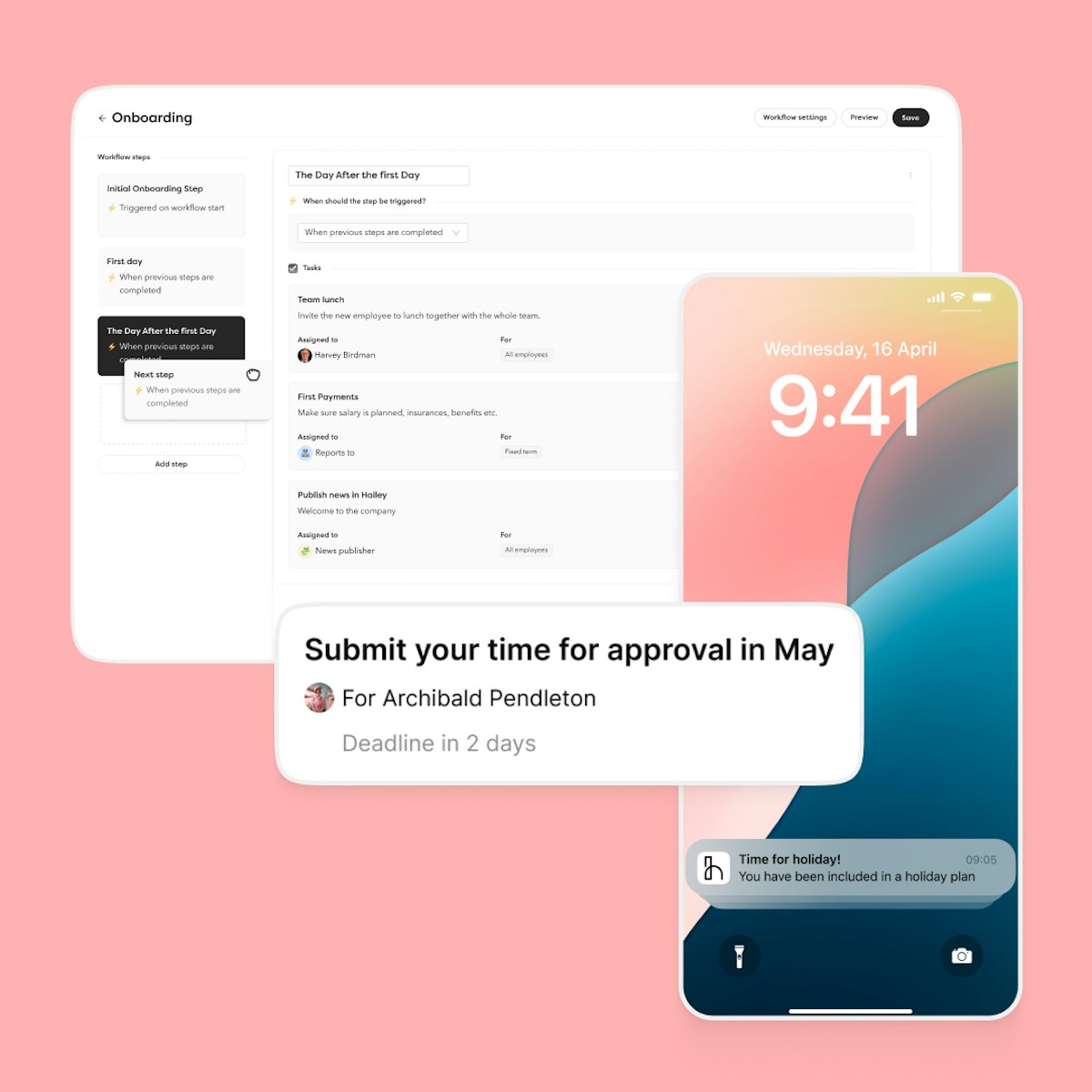 Mitarbeiter verbringen zu viel wertvolle Zeit mit der manuellen Bearbeitung von repetitiven Aufgaben im Zusammenhang mit HR-Prozessen. Durch konfigurierbare Workflows, die zu bestimmten Anlässen in Gang gesetzt werden, automatisiert Hailey die Verteilung und Nachverfolgung aller Schritte des Prozesses. Wir nennen das HR auf Autopilot!