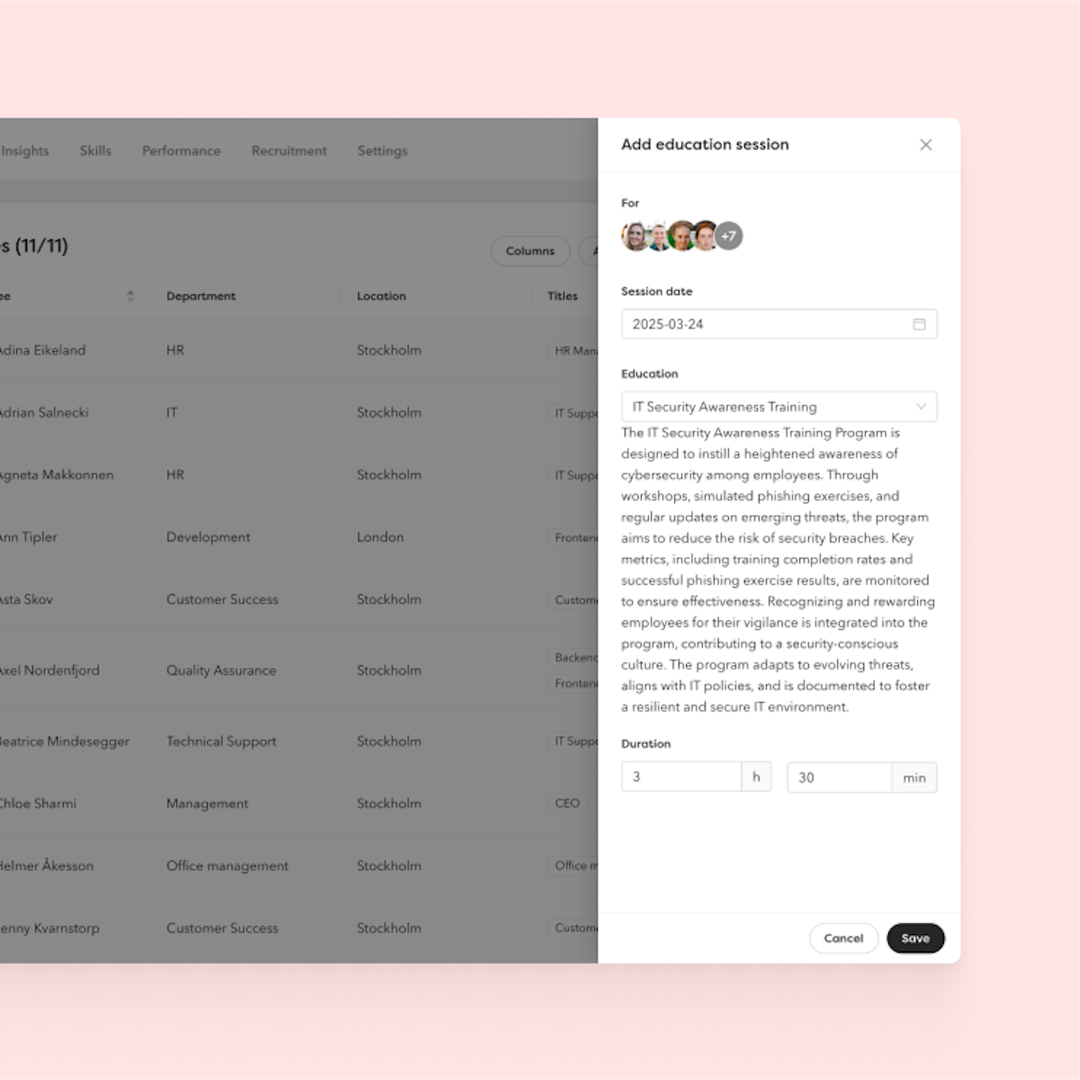 Add upcoming education sessions and keep track of them in Hailey. Start a session via the employee list, and if you need to make adjustments to participants, dates or duration, you can easily do this with just a few clicks.
