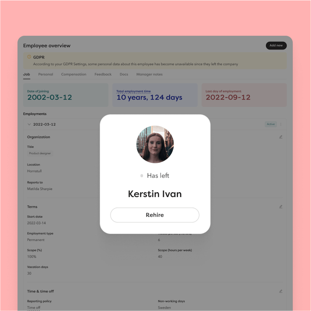 If you later wish to rehire the employee, you can easily reactivate the existing profile and update it with new information. At the same time, the history is preserved in one place, providing a clear and consolidated overview.