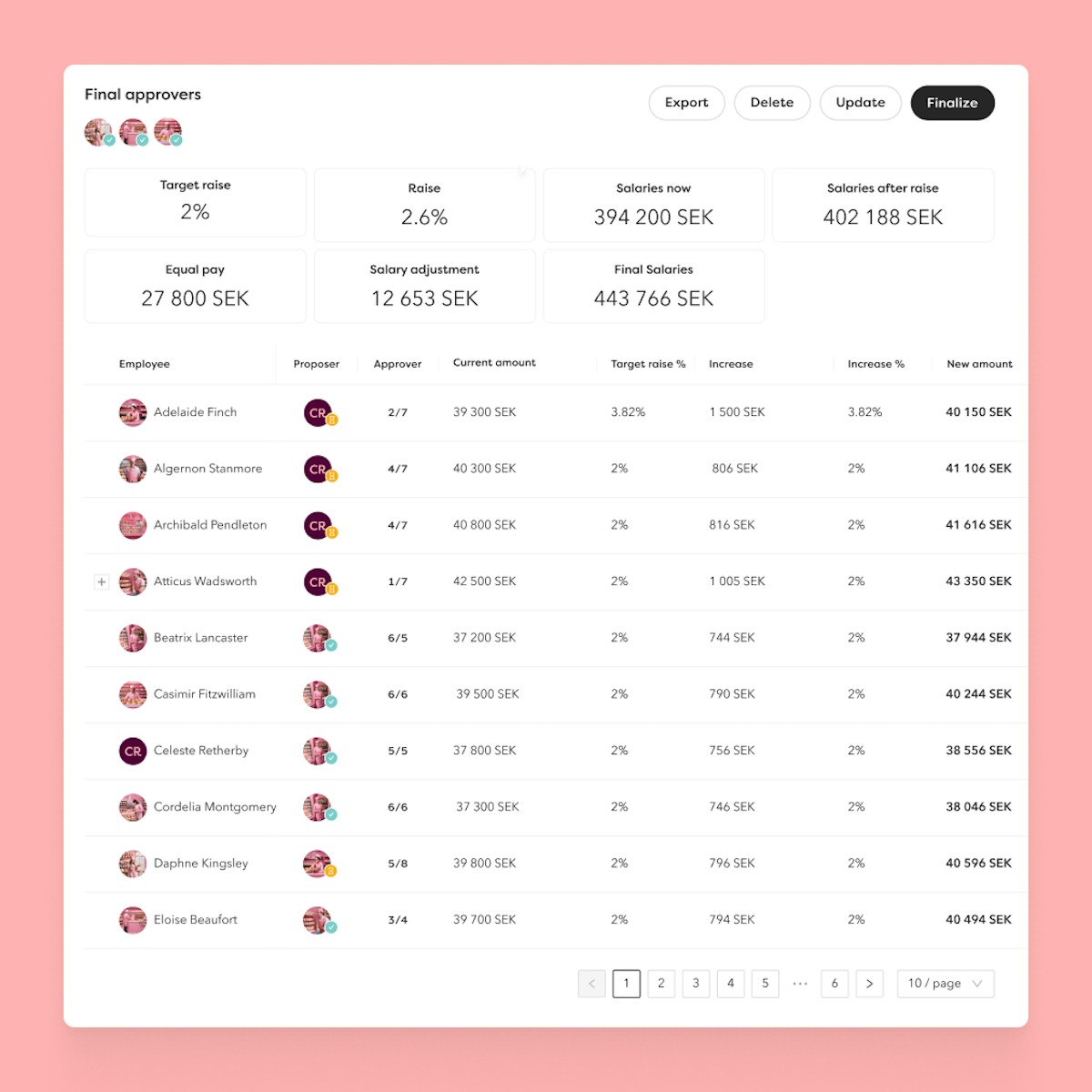 Set a target increase for the entire company, or different ones depending on department or business area. Everything is compiled in one view with convenient filtering options and automatic calculations.
