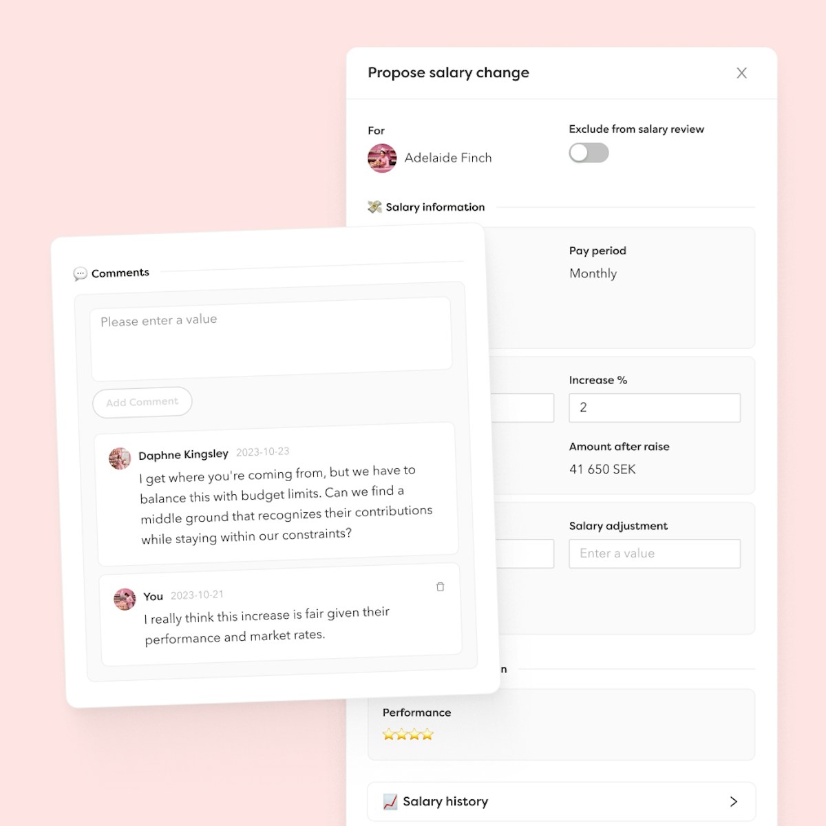 Salary reviews can be a hassle, but not anymore. Ensure the right people in your company are on board before salary changes are locked in. Deciding parties can easily follow the process from beginning to end.