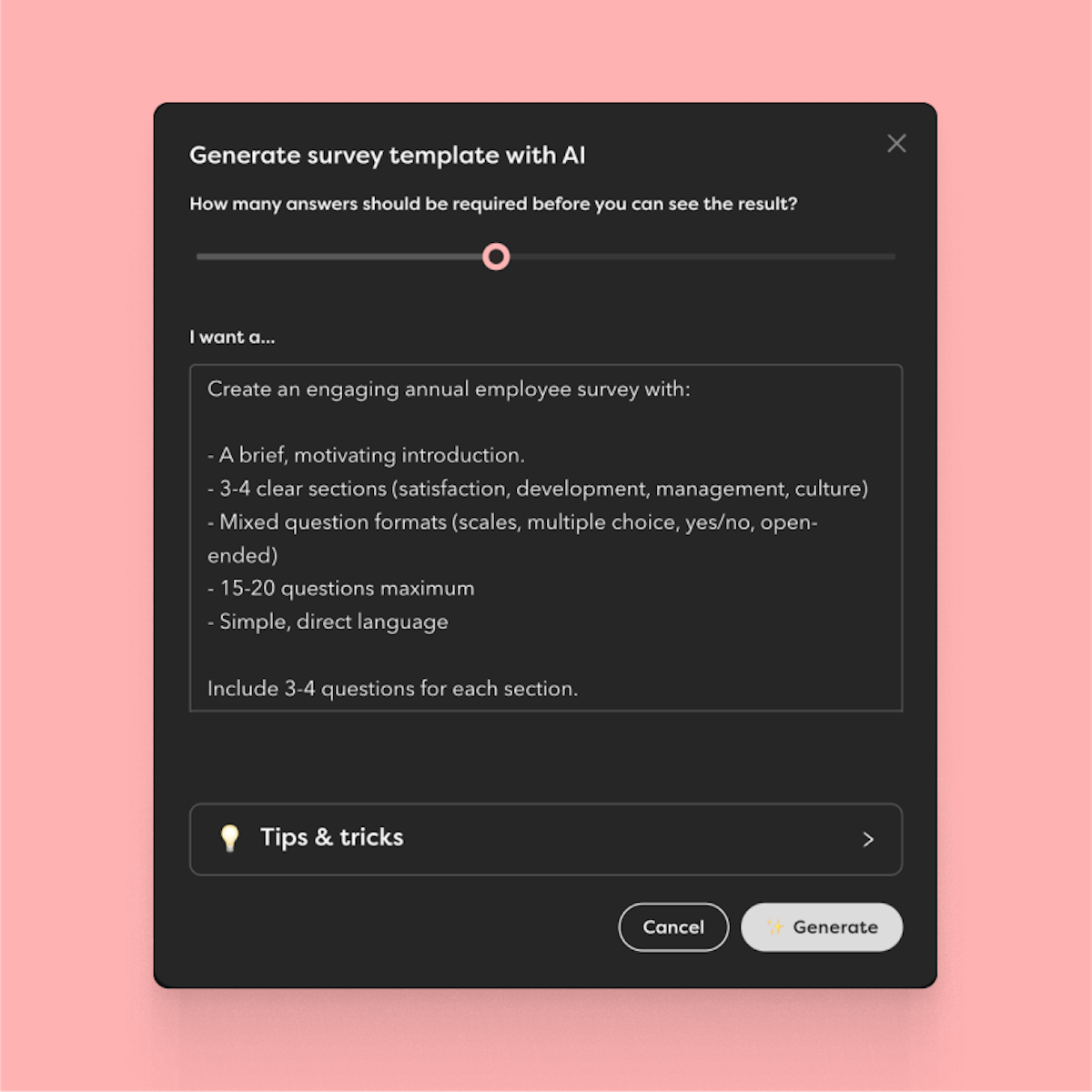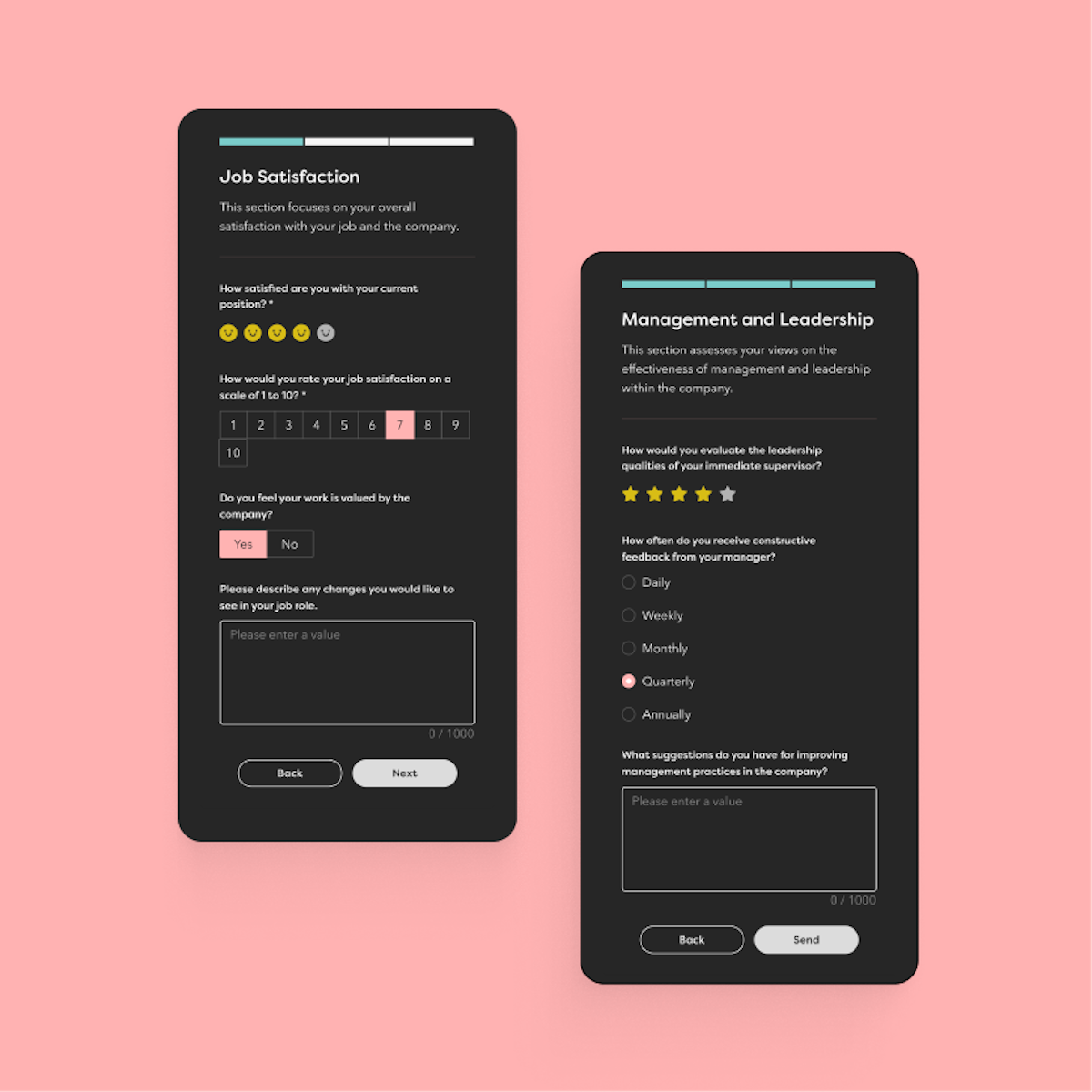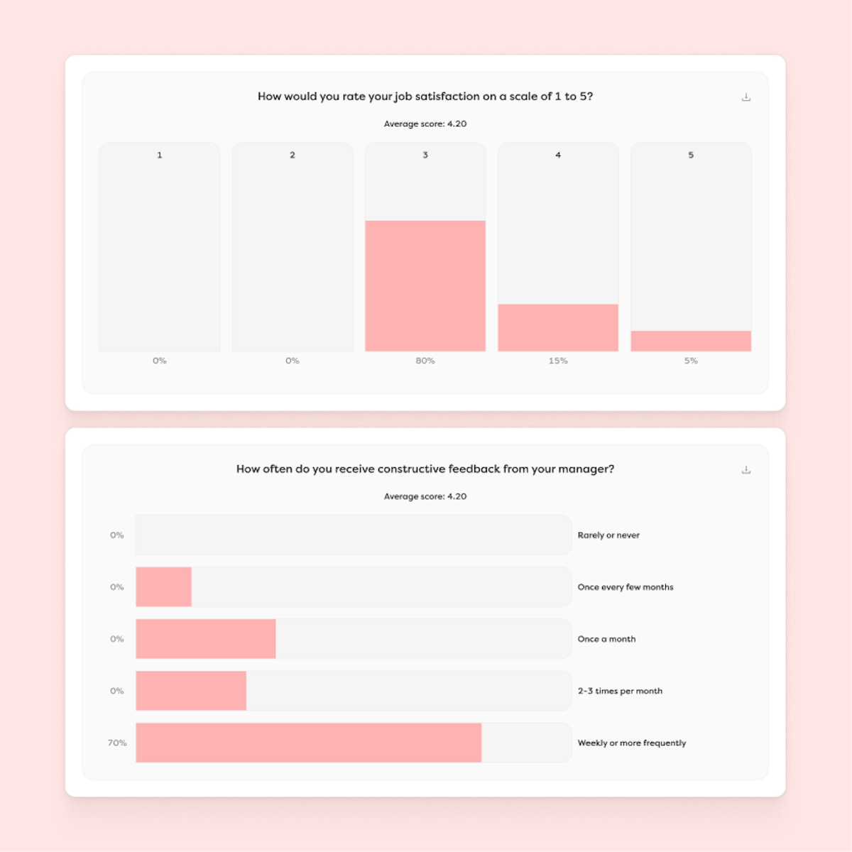 Surveys make it easier to make well-informed decisions. With the help of organisational filters, you can get a clear overview of different parts of your organisation while preserving anonymity at the individual level. This allows you to identify trends and take the next steps towards meaningful improvements.