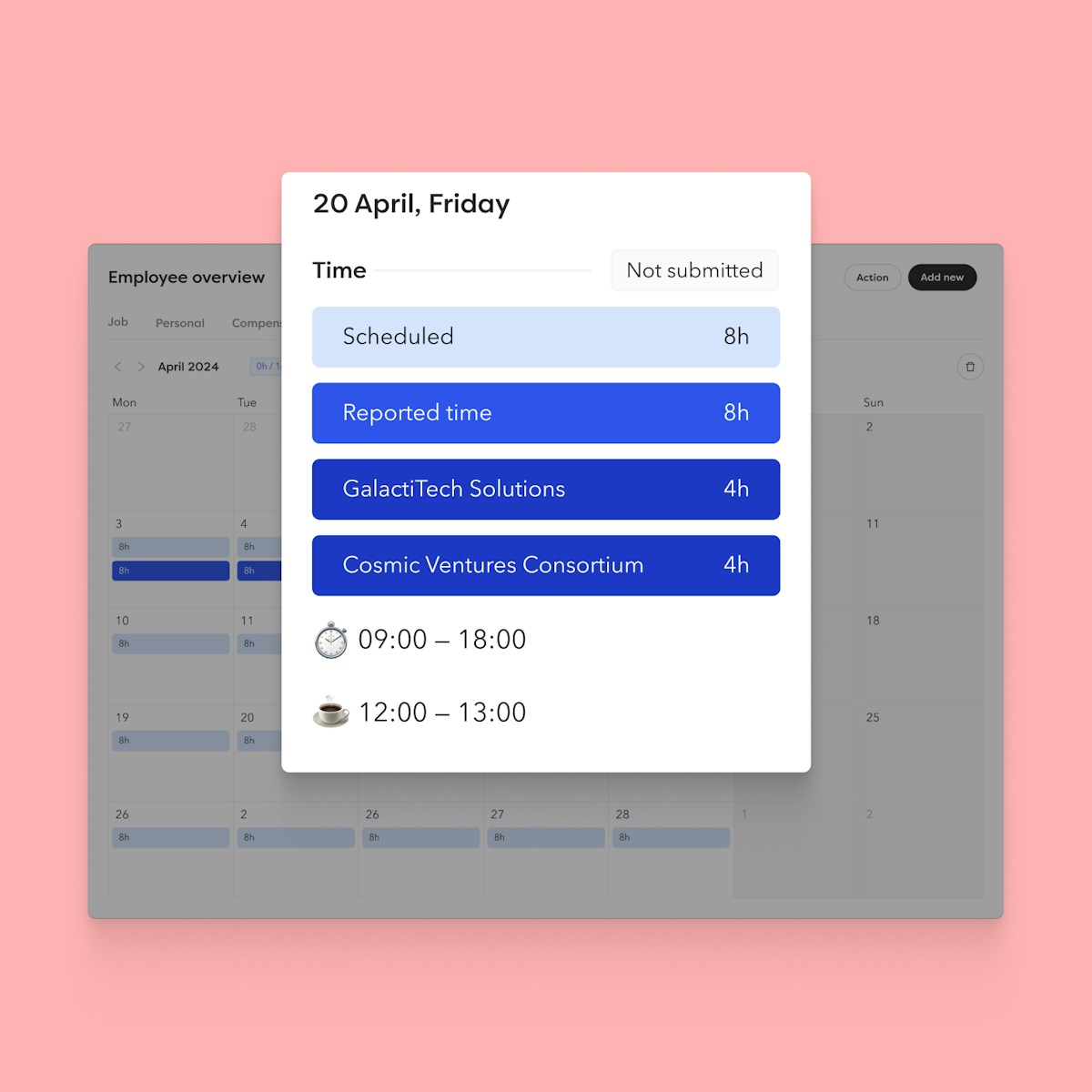 - Time cycles, ensure that your employees report their time, on time. You can easily follow the reported time in relation to scheduled working hours for the month.