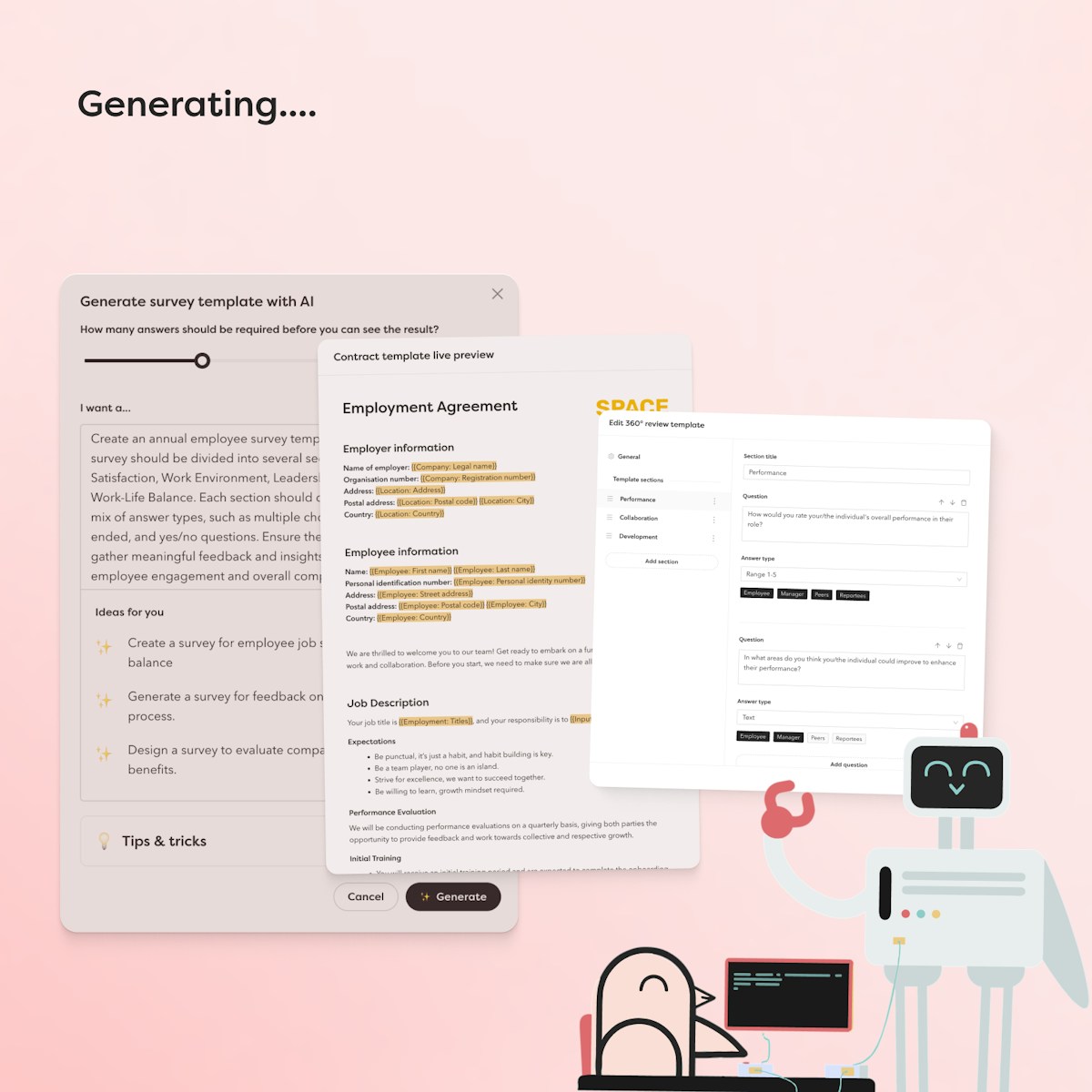 - Generera mallar för medarbetarsamtal och 360 undersökningar.