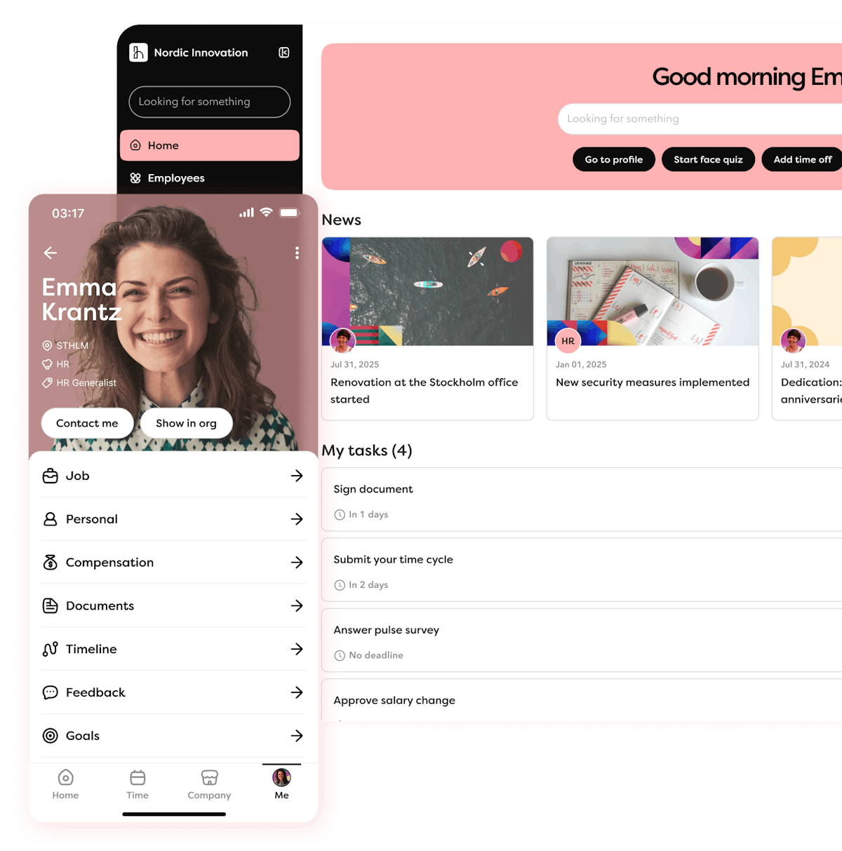 Snabb åtkomst till tidrapportering, frånvarogodkännande och företagsnyheter gör appen till ett naturligt verktyg i vardagen. Notifikationer kortar ner processer då medarbetare kan agera direkt i telefonen, vilket stärker både medarbetarengagemanget och företagskulturen.