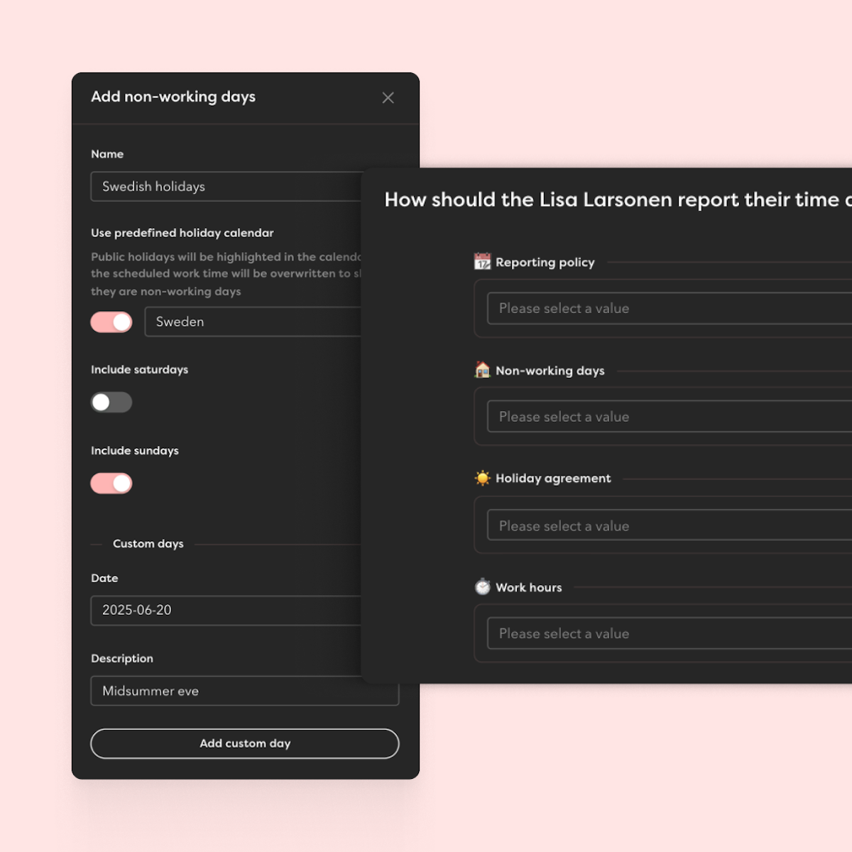 Skräddarsy era frånvaroinställningar för alla delar i organisationen. Skapa landsspecifika kalendrar eller justera policyer baserat på arbetsvillkor. Behåll flexibiliteten samtidigt som du säkerställer en konsekvent hantering.