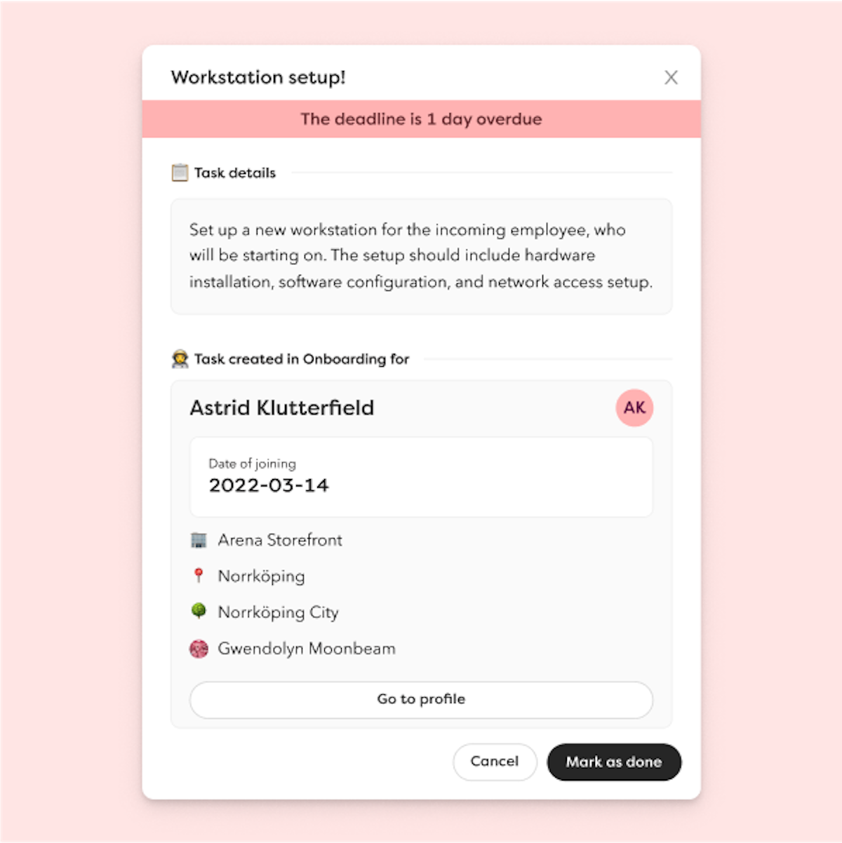 Med en tydlig översikt kan du vara säker på att allt rullar på som det ska, vilket gör det möjligt att upprätthålla höga standarder i hela organisationen. Du bestämmer vem som kan se onboardingöversikten – oavsett om det är chefen, HR eller IT – genom att anpassa roller och åtkomsträttigheter efter era behov.