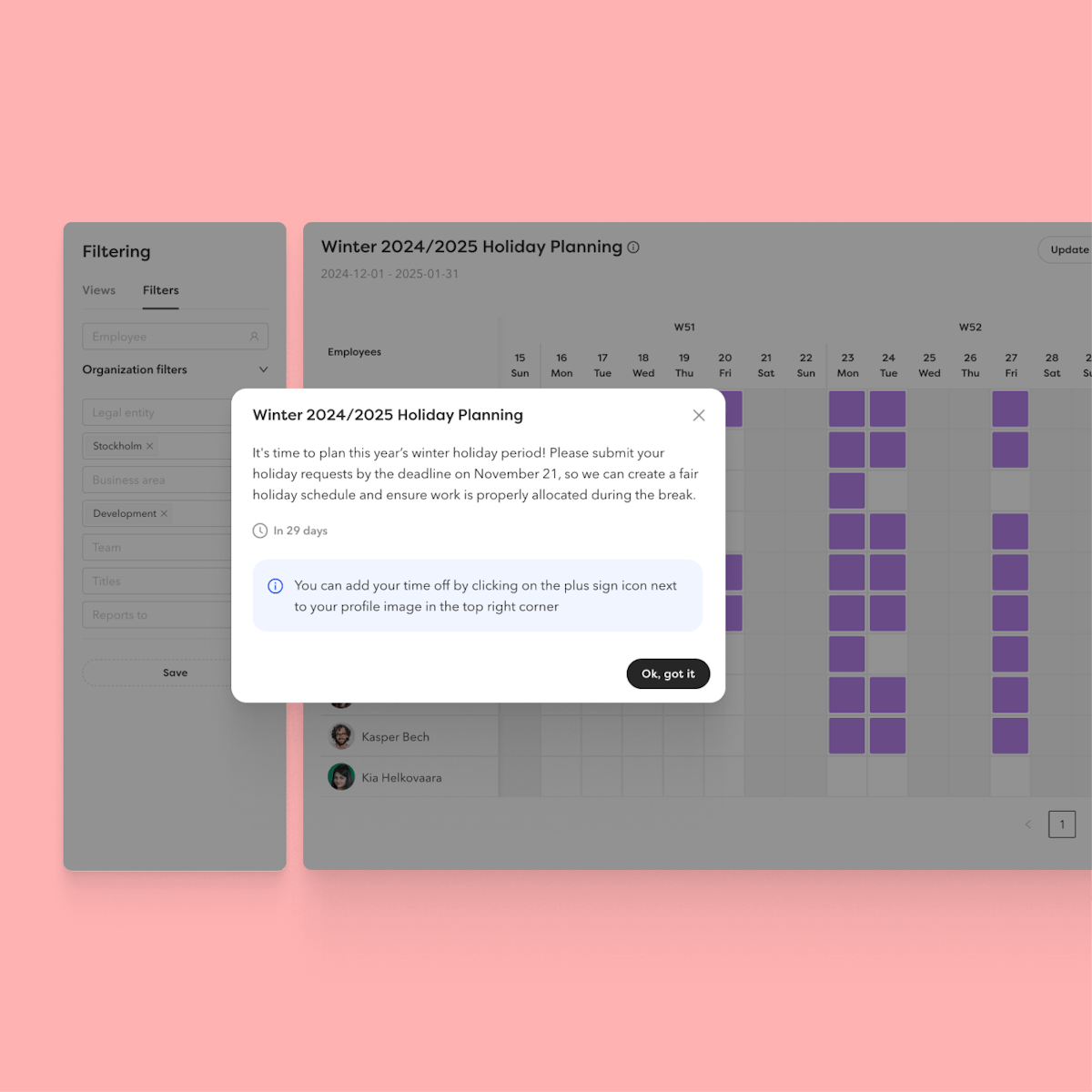 Automatiska notiser och skräddarsydda godkännandeflöden gör processen effektiv. Med bara några klick kan du dela en semesterplan över hela organisationen eller skapa separata vyer för olika team. Resultatet? En smidigare och mer organiserad hantering av frånvaro.