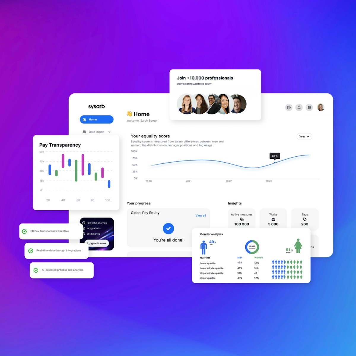 Sysarb hjälper dig bygga en verksamhet där ni behåller top-talang, ökar engagemanget hos medarbetare och minskar legala risker – allt genom Sysarbs smarta plattform för lönetransparens och lönekartläggning.