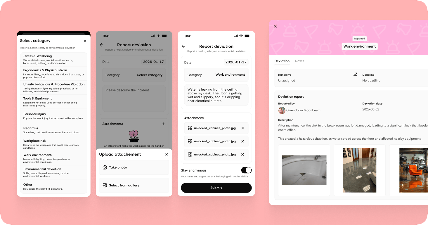 Medarbetare kan nu rapportera avvikelser enkelt via mobilappen. De väljer en kategori, beskriver vad som hänt, anger datum och kan bifoga ett foto – antingen taget direkt via appen eller från bildbiblioteket. För att uppmuntra öppen rapportering finns det även ett alternativ att rapportera anonymt, vilket innebär att hanterare inte ser vem som skickat in ärendet.