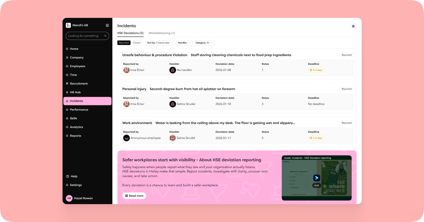 Ny funktionalitet på plats! Medarbetare kan rapportera HSE-avvikelser, vilket ger er det ni behöver för att hantera och följa upp avvikelser. All dokumentation samlas på ett ställe, vilket gör det enkelt för de som rapporterar att följa och se om åtgärder vidtas. Varje avvikelse är en chans att lära och skapa en säkrare arbetsplats.