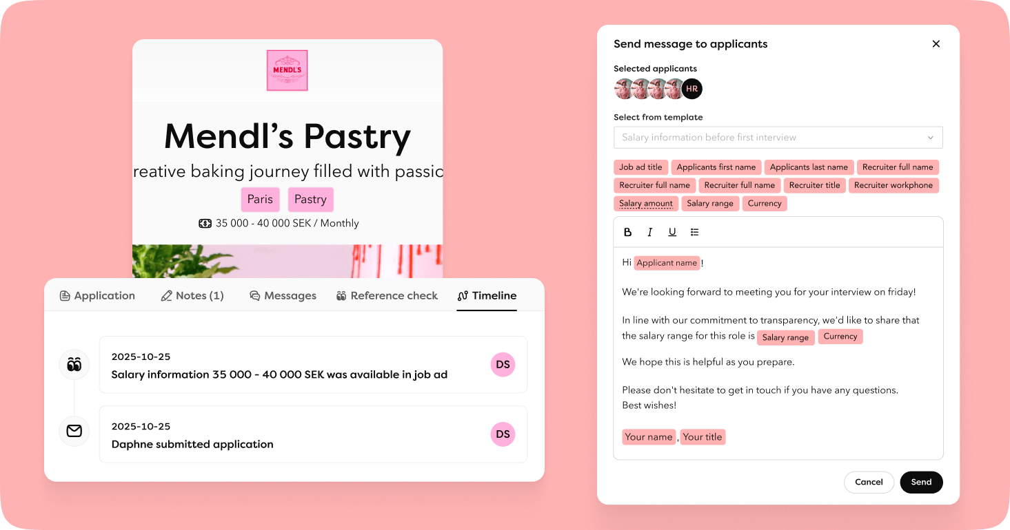- I jobbannonsen – Välj att visa ingångslön eller lönespann för rollen direkt i annonsen för att sätta tydliga förväntningar från start. När lönen kommuniceras via annonsen loggas det automatiskt i kandidatens tidslinje i ansökningsvyn.