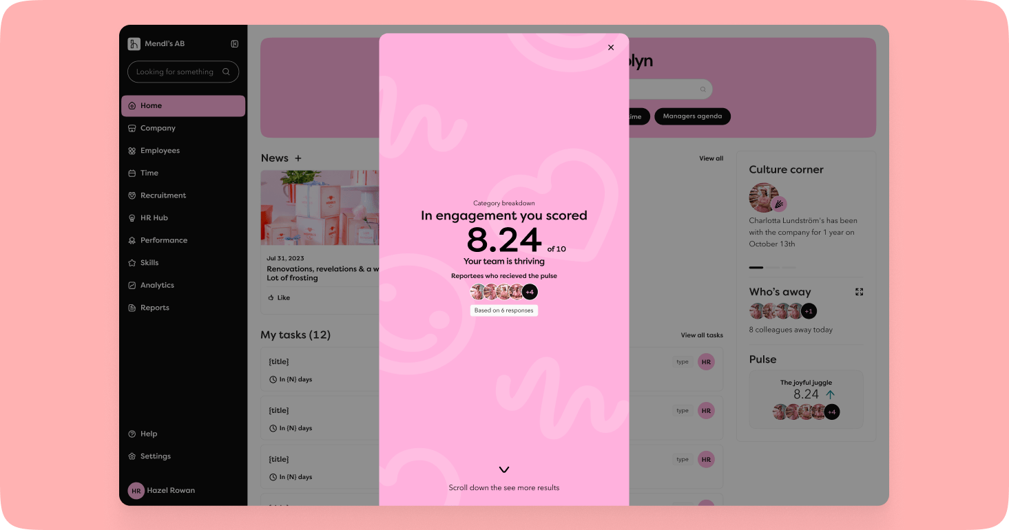 Det kanske viktigaste tillskottet: resultaten kan nu delas direkt med chefer. Det innebär att chefer får en vy över sitt teams pulsmätningar på dashboarden – utan att behöva invänta rapporter från HR. Det gör det möjligt för chefer att agera snabbare på signaler från teamet